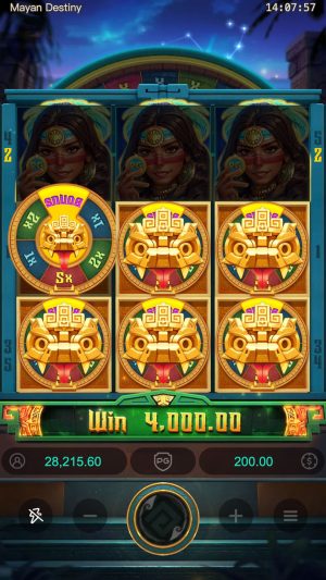 O jogo base em Mayan Destiny tem seus próprios encantos, mas é a Roda do Destino que realmente esquenta as coisas. Para chegar lá, você precisa ficar de olho em um símbolo especial: o Símbolo da Roda de Prêmios. Ele pode aparecer em qualquer um dos carretéis a qualquer momento. Quando ele surge, a mágica acontece e a roda gira, revelando um prêmio instantâneo. Pode ser um multiplicador simples da sua aposta, ou, se a sorte sorrir, o cobiçado segmento “Bonus”. É esse “Bonus” que te joga direto para o coração da ação.