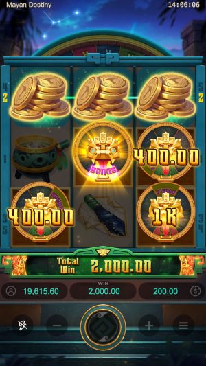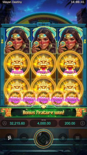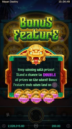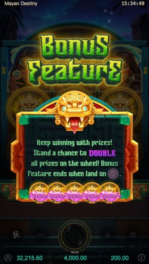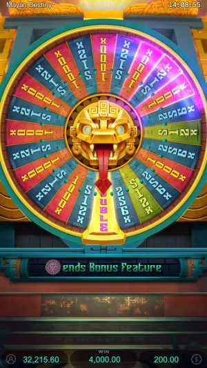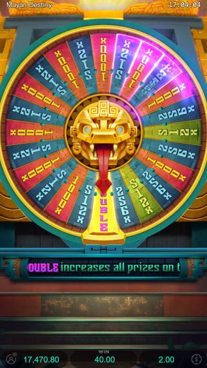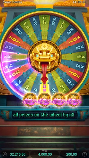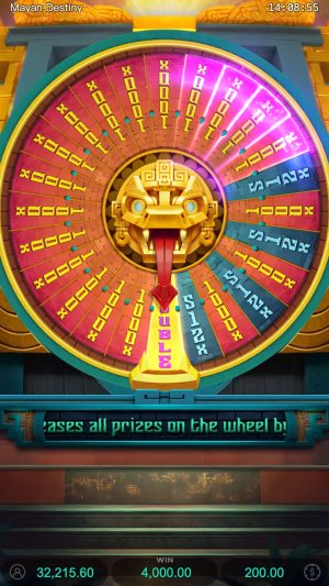 Mayan Destiny é um caça-níquel de vídeo com 3 rolos e 3 linhas, que conta com uma roda bônus com prêmios que podem ser aprimorados. Durante qualquer rodada do jogo principal, a Função Bônus será ativada quando o símbolo da Roda de Prêmios cair em “Bônus”, fazendo surgir uma grande roda que concede prêmios de até 10x o valor da aposta. Se o ponteiro parar na casa “Dobro”, os valores dos prêmios serão dobrados!