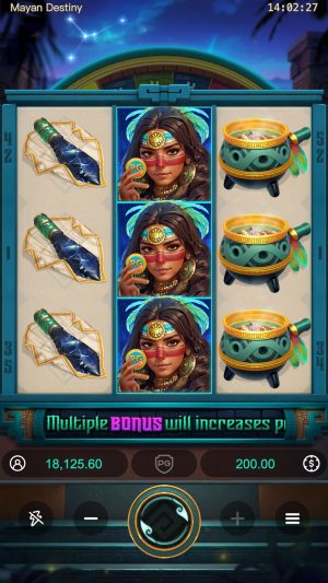 - Mayan Destiny é um slot da PG Soft com tema maia, jogado em 3×3 com 5 linhas de pagamento e alta volatilidade.